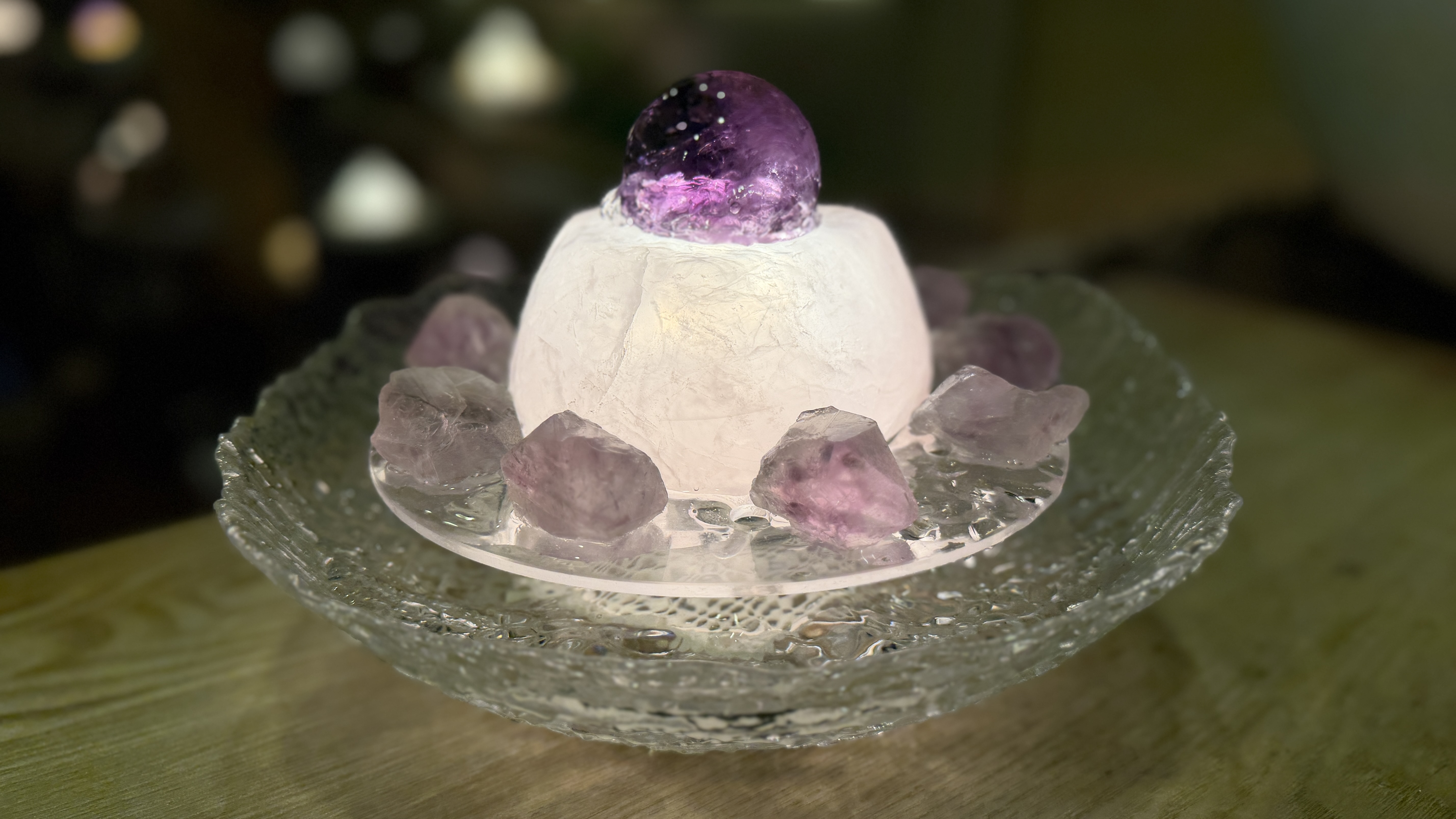 アメジストファントム/ローズクォーツ【ARH3973】 アメジストファントム/ローズクォーツ【ARH3973】 (ARH3973) 淡く重なり合うピンクと紫の光が、静かな癒しを広げる佇まい。 空間にそっと灯る希望のようです。 アメジストファントムは内面の成長と浄化を促し、ローズクォーツ が自己受容と優しい愛を満たします。過去を抱きしめながら前へ 進む力を与え、心を深く落ち着かせるファウンテンです。 (球体の種類)アメジストファントム 5.1㎝ (台座石の種類)ローズクォーツ (周りの小石の種類)アメジスト (器の種類)アイスベルク φ26 在庫状態 : 在庫有り ¥120,000(税込) 数量