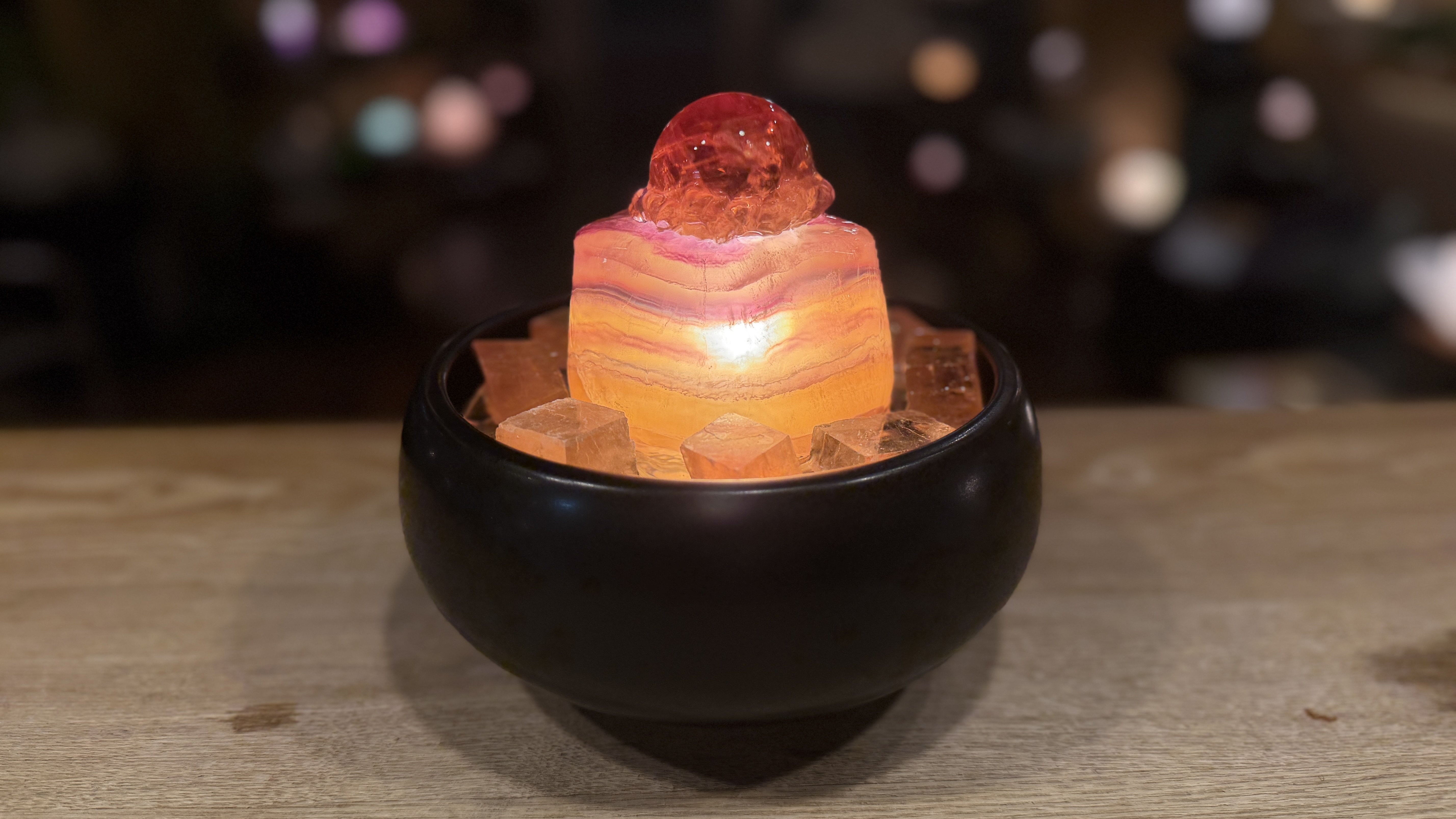 カルサイト球に、レインボーフローライトを重ねたファウンテン。