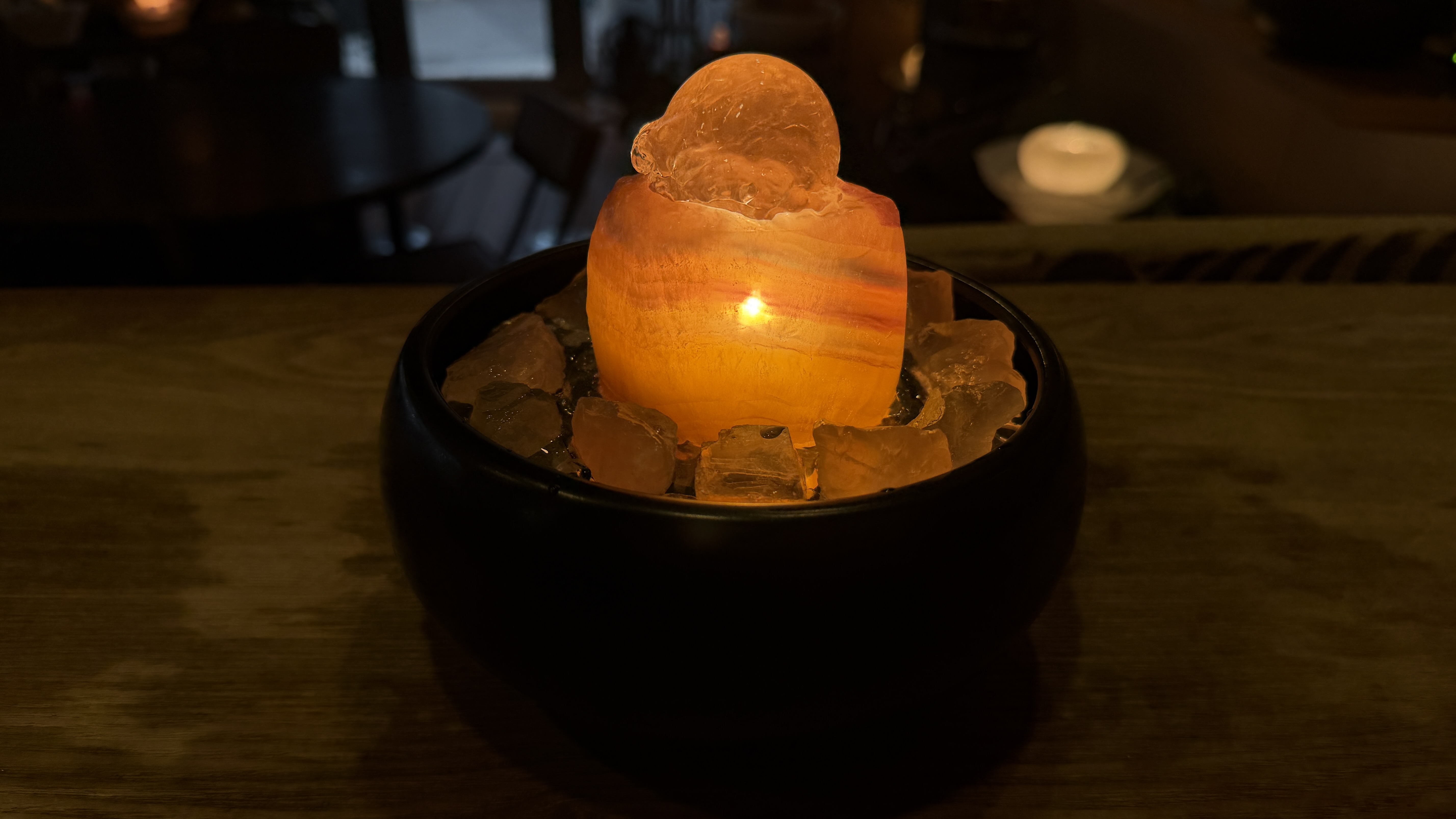 スーパークリアーゴールデン/レインボーフローライトミニ【GFH4065】 スーパークリアーゴールデン/レインボーフローライトミニ【GFH4065】 (GFH4065) 澄みきったスーパークリアーゴールデンに、レインボーフローライトの層が重なるミニファウンテン。濃淡なゴールドの光が、直感と現実を同時に磨いていきます。小さくても安心感のある存在感。感性で選び、結果へつなげたい方へ。静かな輝きが、あなたを成功へと導いてくれるでしょう。 (球体の種類)スーパークリアー 3.7cm (台座石の種類)レインボーフローライト (周りの小石の種類)ゴールデンカルサイト (器の種類)ベーシックミニ黒 φ18 在庫状態 : 在庫有り ¥75,000(税込) 数量