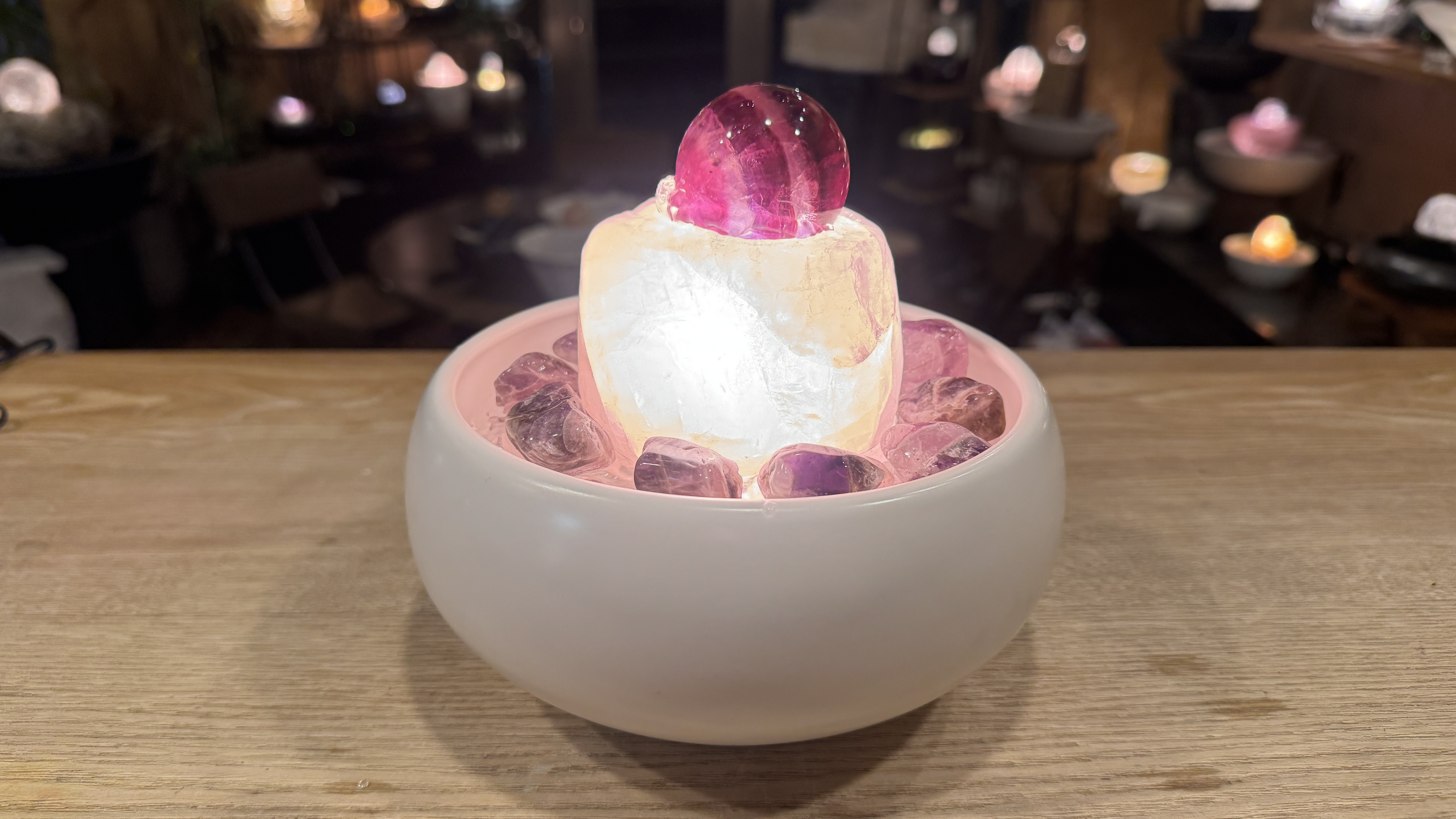 優しいピンクの光を纏ったローズクォーツ台座石に、深い癒しと