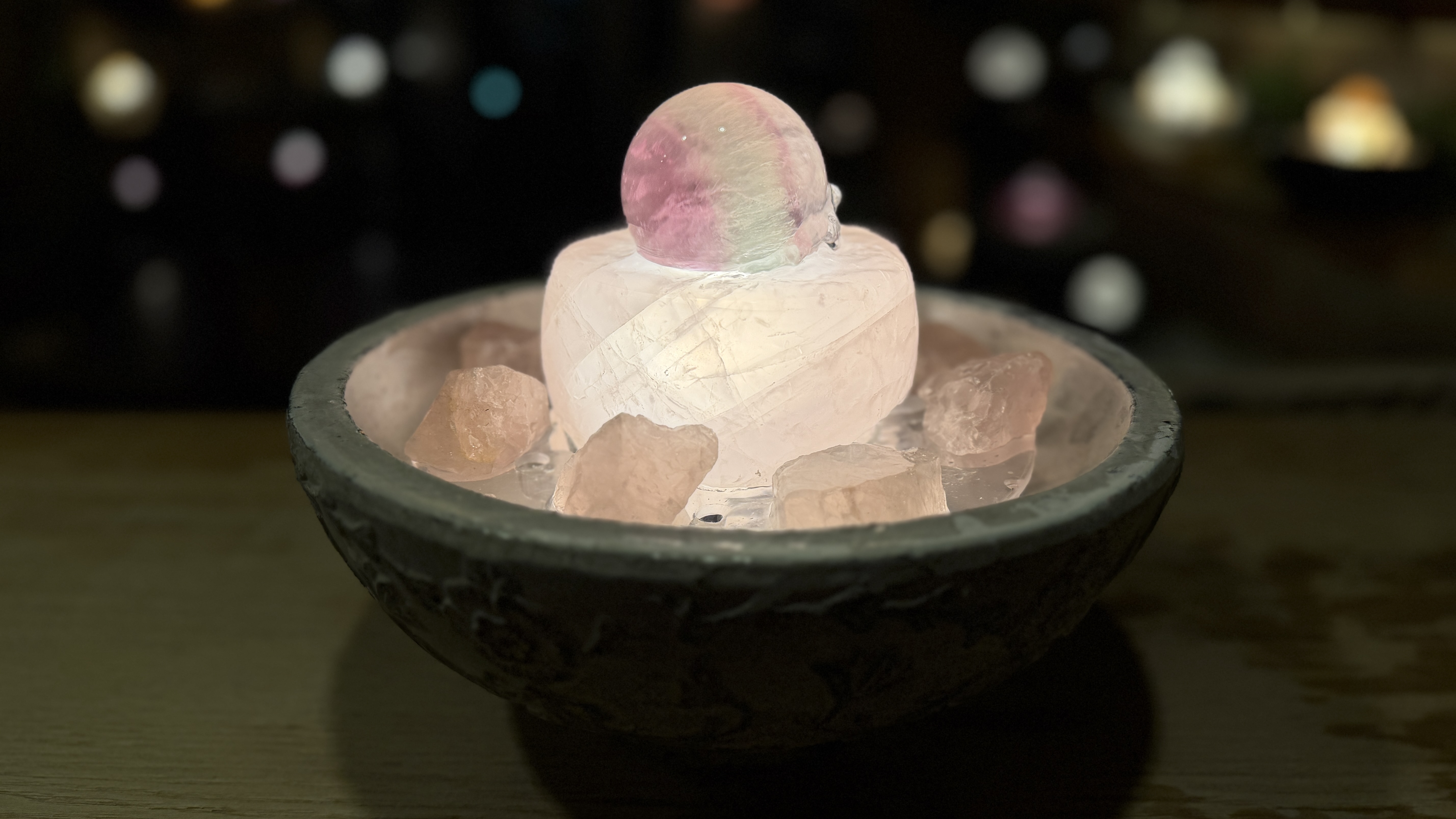 マルチフローライト/ローズクォーツ【FRH3952】 マルチフローライト/ローズクォーツ【FRH3952】 (FRH3952) 優しい色合いが溶け合うマルチフローライトとローズクォーツ の組み合わせ。 思考と感情のバランスを整え、心の緊張をゆっくり解いていきます。 過去の感情を手放し、ありのままの自分を受け入れるサポートに。 安心感のある空間作りや穏やかな人間関係を育てたい方に ぴったりなファウンテンです。 (球体の種類)マルチフローライト 5.7cm (台座石の種類)ローズクォーツ (周りの小石の種類)ローズクォーツ (器の種類)ガーデン φ25 在庫状態 : 在庫有り ¥150,000(税込) 数量