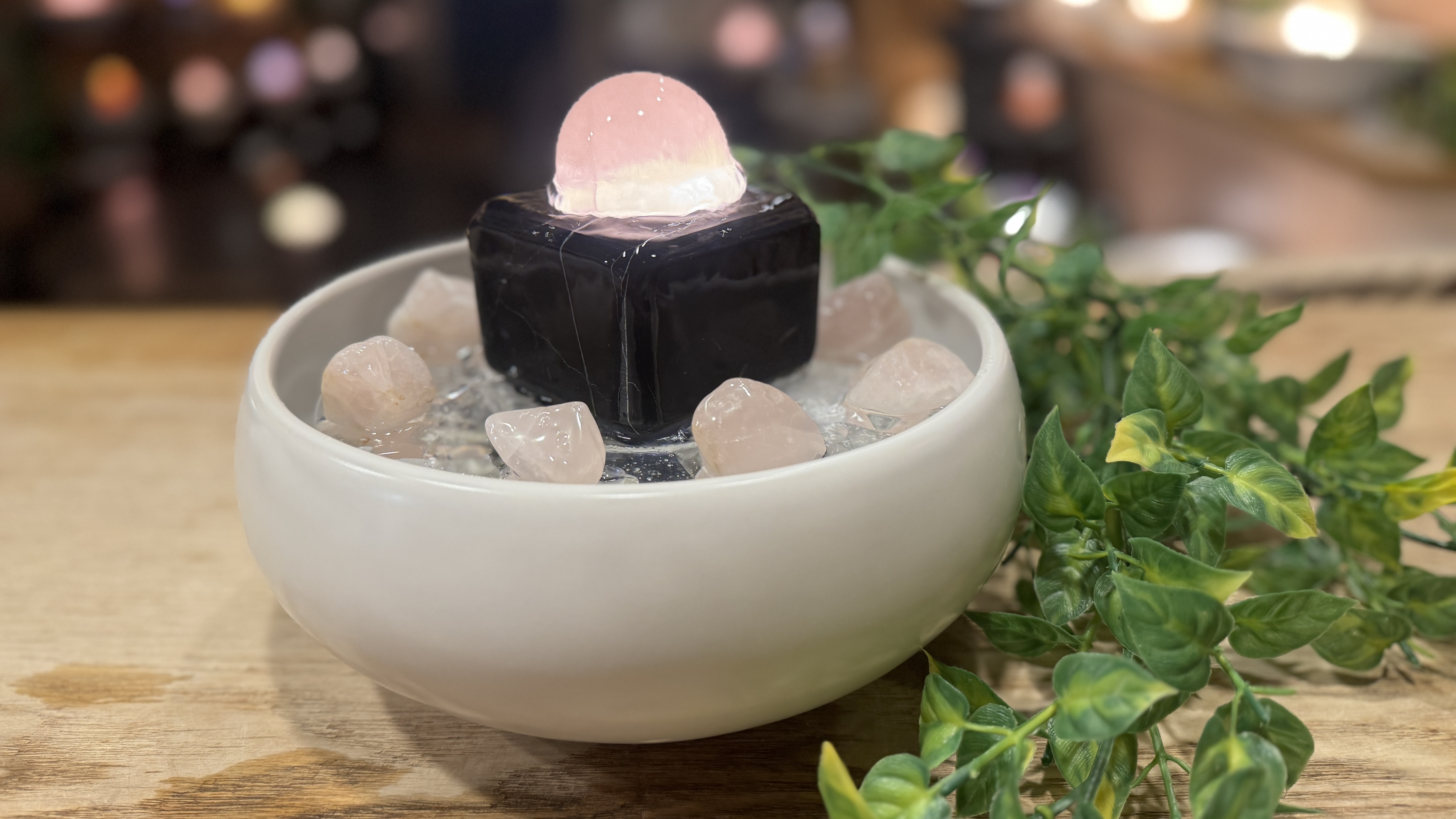 優しい光をローズクォーツ球と、艶やかな大理石の台座石に
