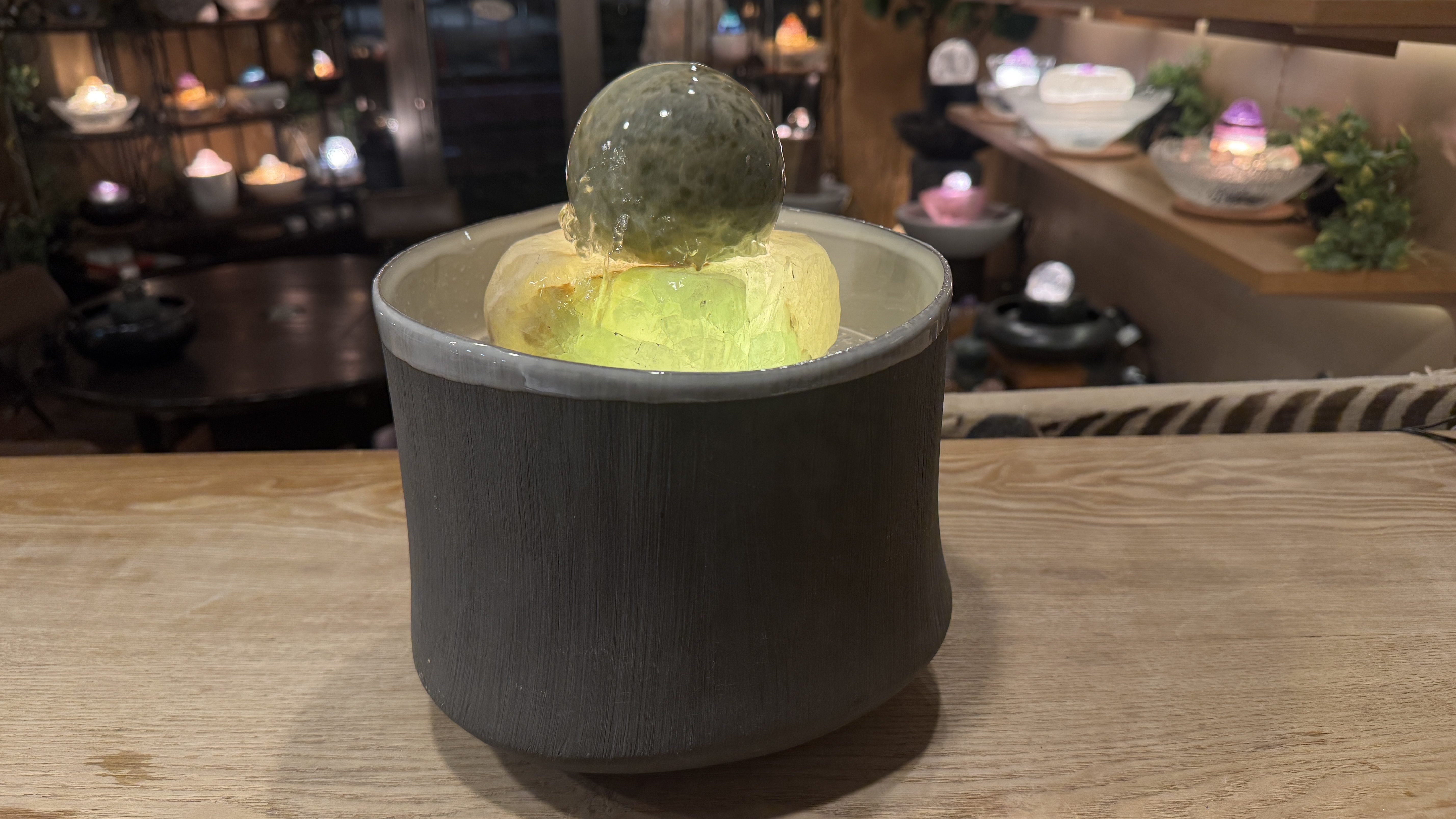 大玉グリーンカルサイト【GCH3900】 大玉グリーンカルサイト【GCH3900】 (GCH3900) 柔らかな光をまとったグリーンカルサイトが、水面から静かに 立ち昇る癒しのファウンテンです。 心の緊張をふっと緩め、思考を整え、深呼吸したくなるような 「やさしいリセット」をもたらします。 球体のグリーンカルサイトは超大玉級。光をあまり通さない分、 静かな波動で空間を満たします。 究極の落ち着きを求める方におすすめです。 (球体の種類)グリーンカルサイト 7.8cm (台座石の種類)グリーンカルサイト (周りの小石の種類)無し (器の種類)ダックス 在庫状態 : 在庫有り ¥150,000(税込) 数量
